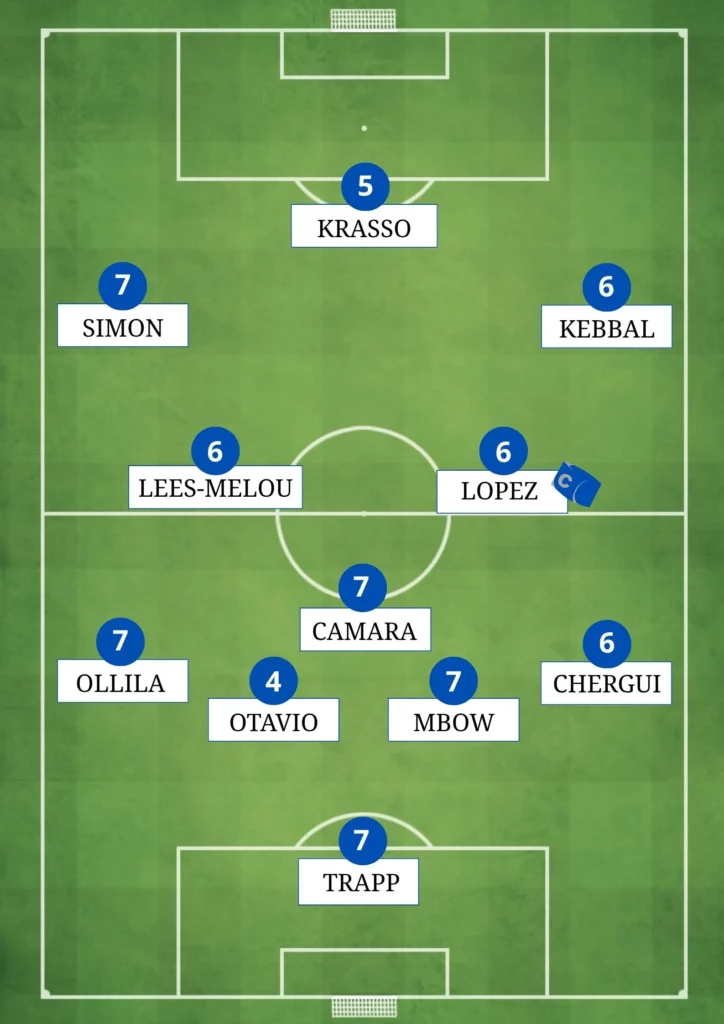Un peu en dessous de ses partenaires de défense, il est remis en question par Lees-Melou mécontent de ses anticipations en première mi-temps. Le Portugais n’en reste pas moins un joueur intéressant et il le prouve plusieurs fois. Mais il se fait aussi passer plusieurs fois par son vis à vis durant le match. Heureusement que son coéquipier Camara l’a couvert. Par exemple, Otavio est trop court à la 58e, et cette fois c’est son gardien qui sauve la mise. A la 66e, il concède un coup-franc dangereux sans raison. En bref, il souffle le chaud et le froid. Le petit plus, ses quelques bonnes passes vers l’avant.