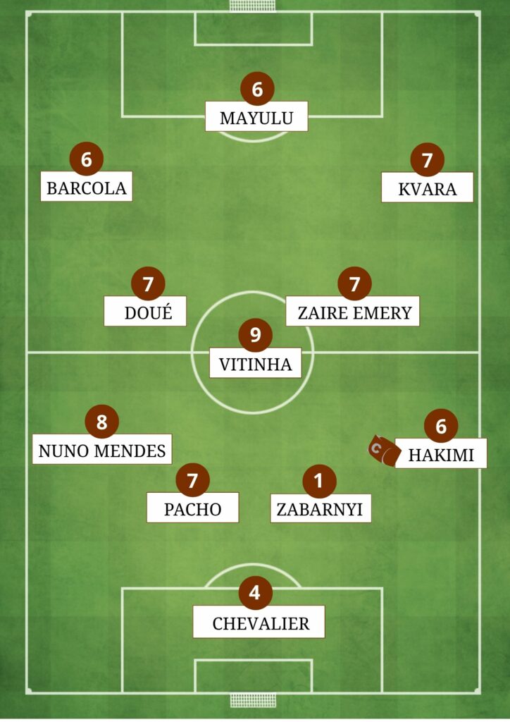 VITINHA – 9 Le Quaterback du PSG a terminé sa 1ere mi-temps sans la moindre perte de balle. Des transversales magiques, des passes qui cassent les lignes, le Portugais est un régal. Sa remontée de balle sur 40 mètres, et son caviar pour Nuno Mendès sur le 5-1 (49eme), ont encore illuminés sa rencontre. Un festival conclu par le 7eme but Parisien d’une frappe précise aux 20 mètres. Un match presque parfait;