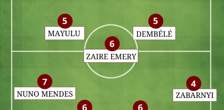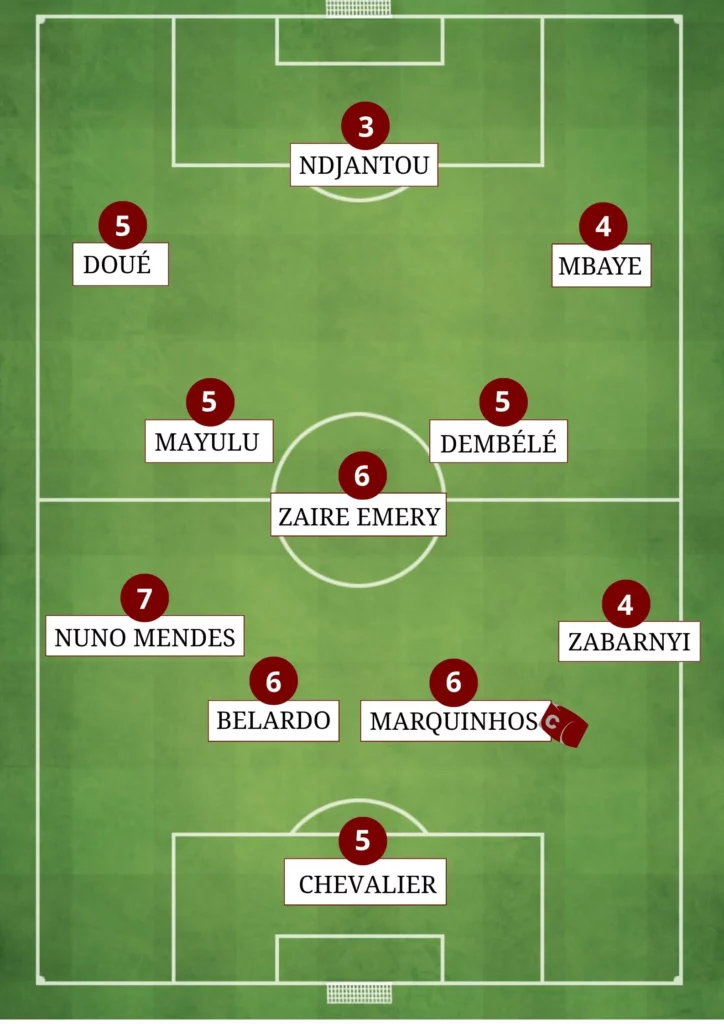 Homme du match côté Parisien – VITINHA : 6 Capitaine ce soir, il délivre encore un caviar pour Kvara, et reste l’un des milieux de terrain les plus sexy d’Europe. Le Brassard lui va si bien.