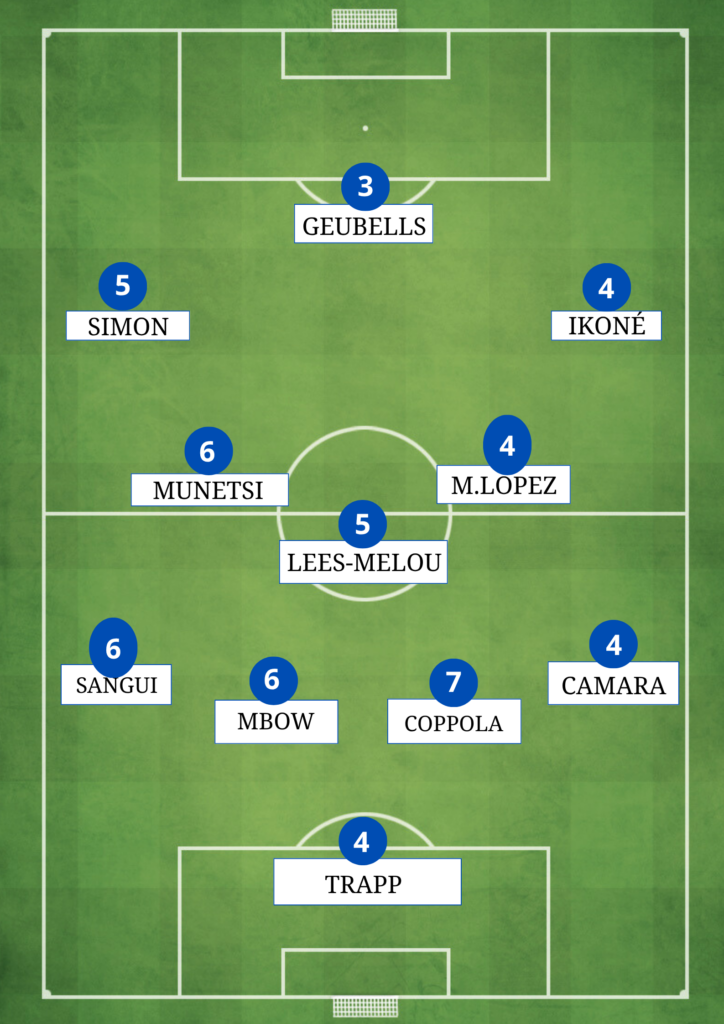 SIMON – 5 Après ses deux buts avec le Nigeria, il avait encore faim et a été le seul élément offensif à prendre des initiatives dans la première demi-heure de jeu. Il est souvent passé en un contre un, mais les centres qui en découlaient n’étaient jamais assez précis. Un petit côté chien fou. Remplacé par CHERGUI (90+3).