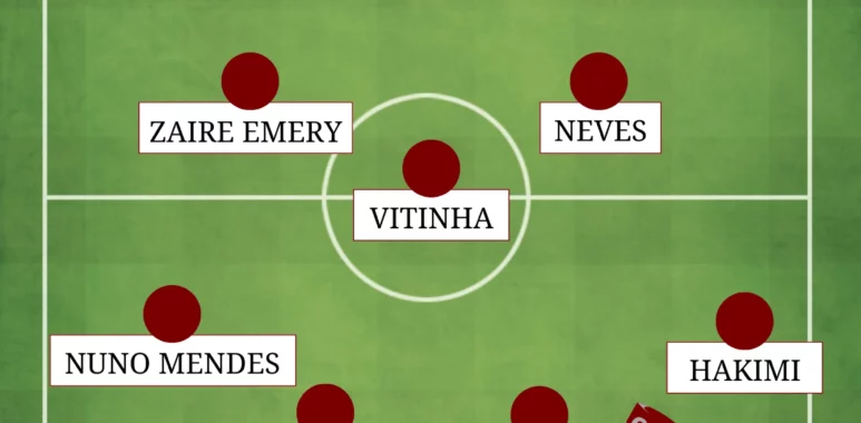 Chevalier – Hakimi, Marquinhos, Pacho, Nuno Mendes – Zaire-Emery, Vitinha, Neves – Kvara, Dembélé, Barcola