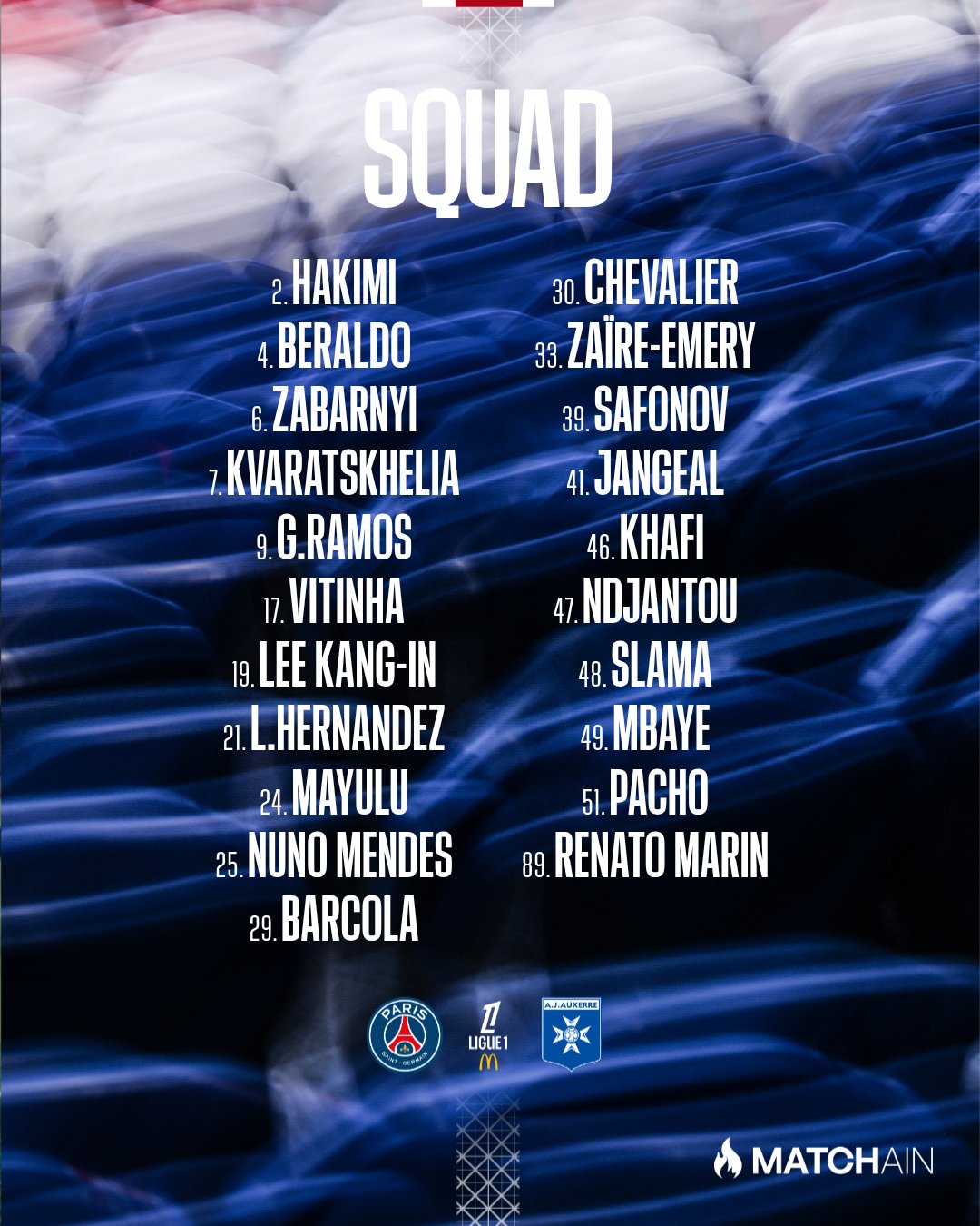 Pour cette 6eme journée et la réception d’Auxerre ce soir (21H05), l’infirmerie parisienne ressemble toujours aux urgences de la Salpétrière. Manquent encore à l’appel, Fabian Ruiz, João Neves, Désiré Doué, le capitaine Marquinhos, et le Ballon d’Or Ousmane Dembélé. De retour dans le groupe, Bradley Bracola uniquement.