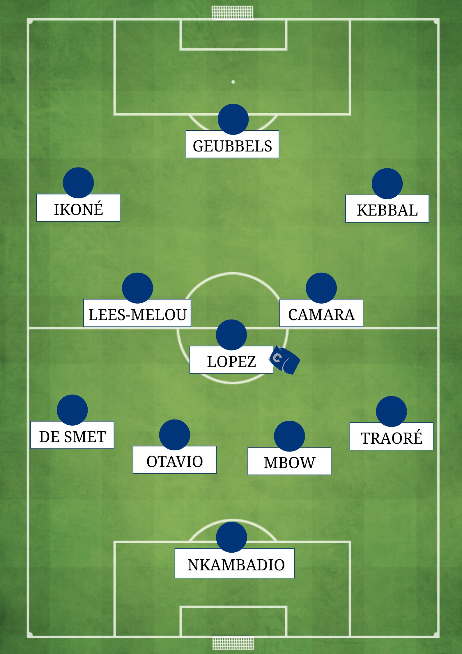 Nkambadio – De Smet, Otavio, Mbow, Traoré – Lees-Melou, Camara, Lopez – Ikoné, Geubbels, Kebbal